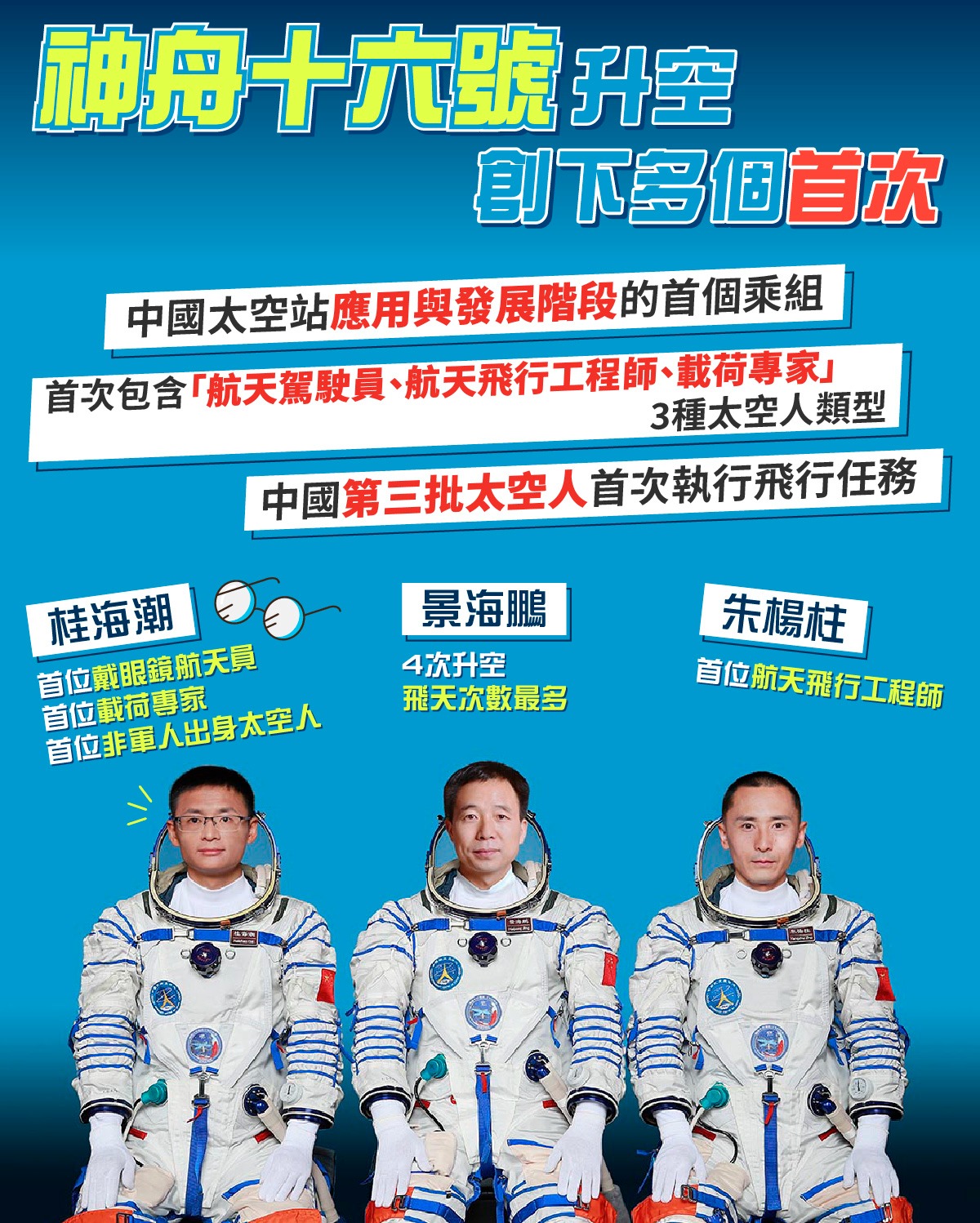 據介紹,這次是中國第三批太空人首次執行飛行任務,也是航天飛行工程師(朱楊柱)和載荷專家(桂海潮)的首次飛行。