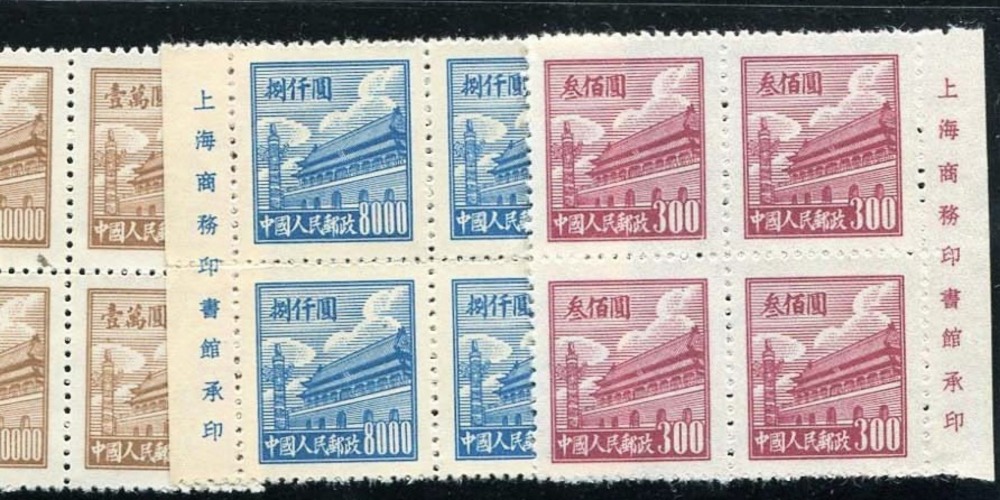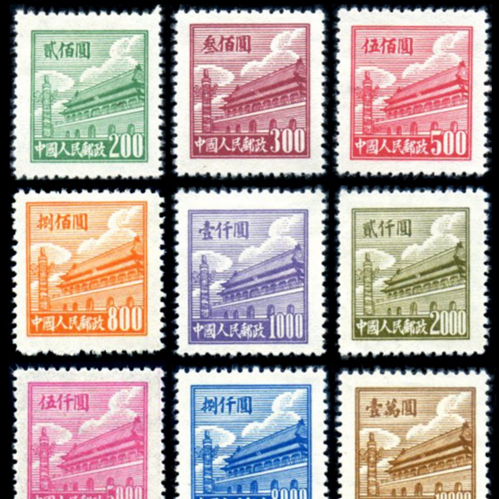 中國發行的第一套普通郵票,編號「普1」,全套共有9枚。郵票採用膠版印刷,以天安門為主要圖案,但當時城樓上並沒有懸掛毛澤東畫像。