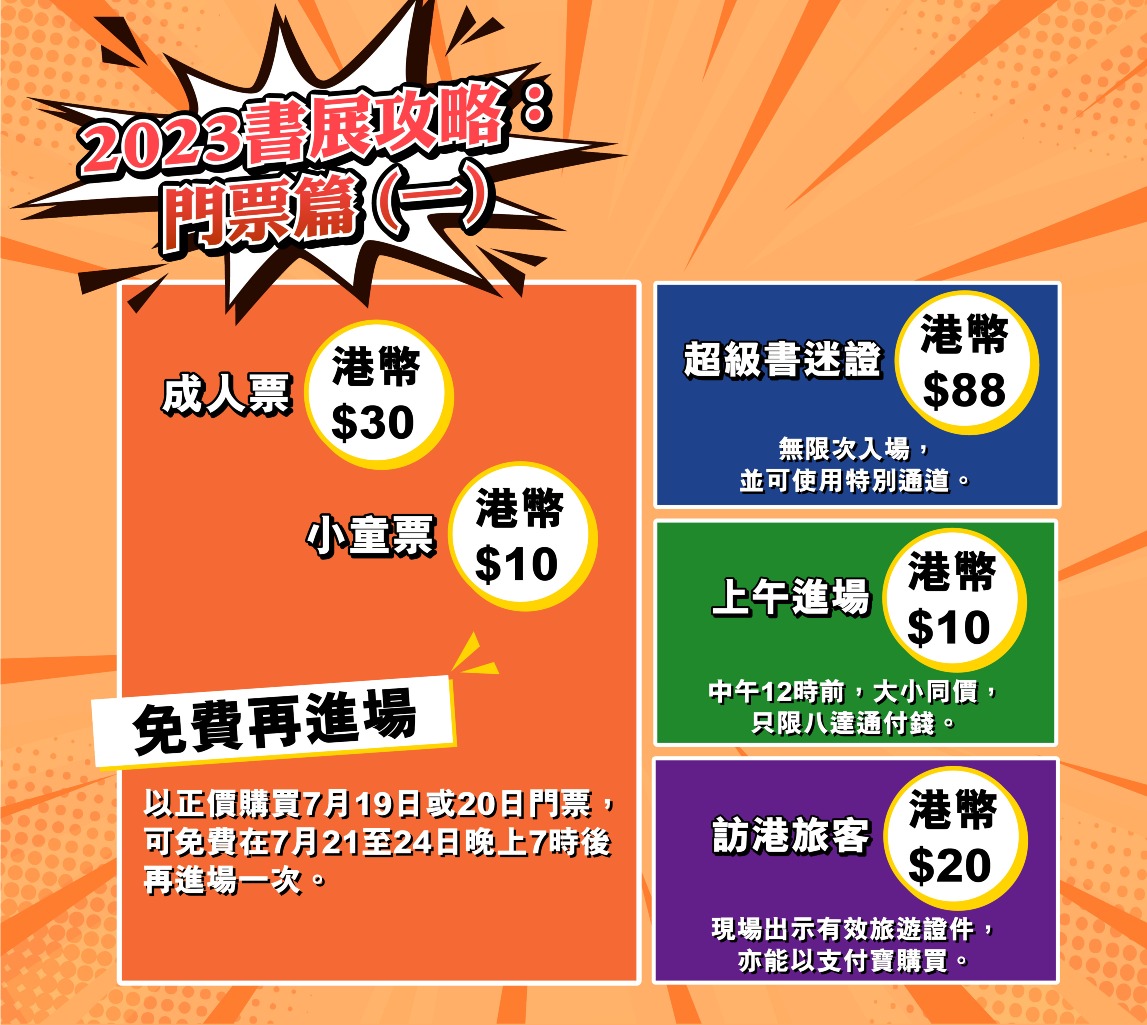 與往年稍有不同,今年的書展不設晚間門票,不過有免費再入場特別優惠。只要購買指定日期的正價門票,就可以在指定日期的晚上7時後免費入場一次。