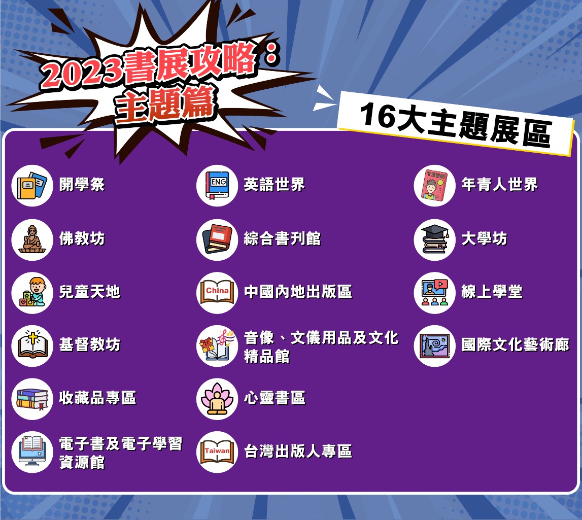 今年書展設有16大主題展區,其中包括有嶄新的「國際文化藝術廊」,匯聚世界各地的文化藝術作品,並以輕鬆及有趣的方式,向大眾呈現百花齊放的文化瑰寶。