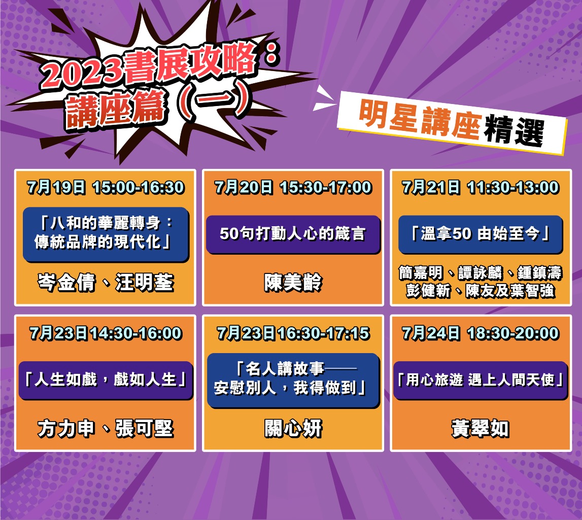 有不少名人明星將參與書展研討會,分享演藝路及各自的故事,包括溫拿樂隊、汪明荃、方力申、關心妍、黃翠如、陳美齡等。