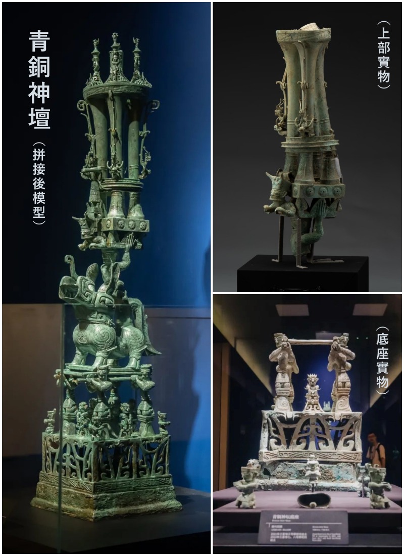 當中的最大亮點,包括3組「跨坑拼對」的文物,分別是青銅神壇、青銅騎獸頂尊人像、青銅鳥足神像,它們各自都是由不同祭祀坑出土的多個部件組合而成。