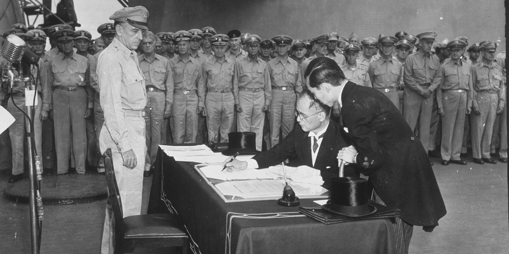 1945年8月15日,日本宣佈無條件投降。9月2日上午9時(東京時間),參加對日作戰的同盟國代表,在停泊於日本東京灣的美軍軍艦上接受日本投降,並舉行簽字儀式。