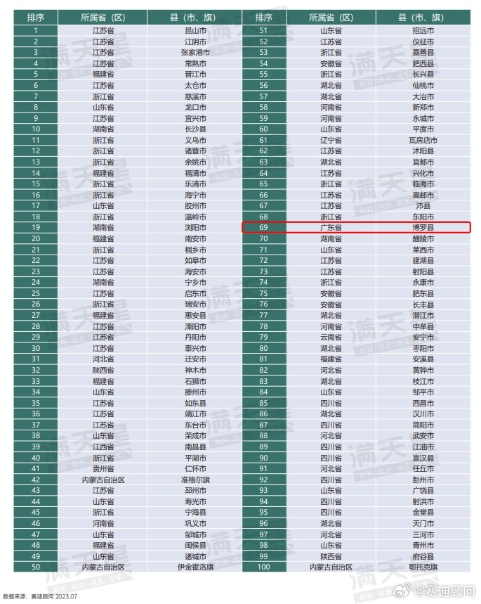 此外,還有一點值得留意的是,廣東雖然是國內經濟第一強省,在經濟總量上也一直力壓江蘇,但在百強縣中,廣東卻只有惠州博羅縣這1個縣上榜,而且排名靠後,位居第69。