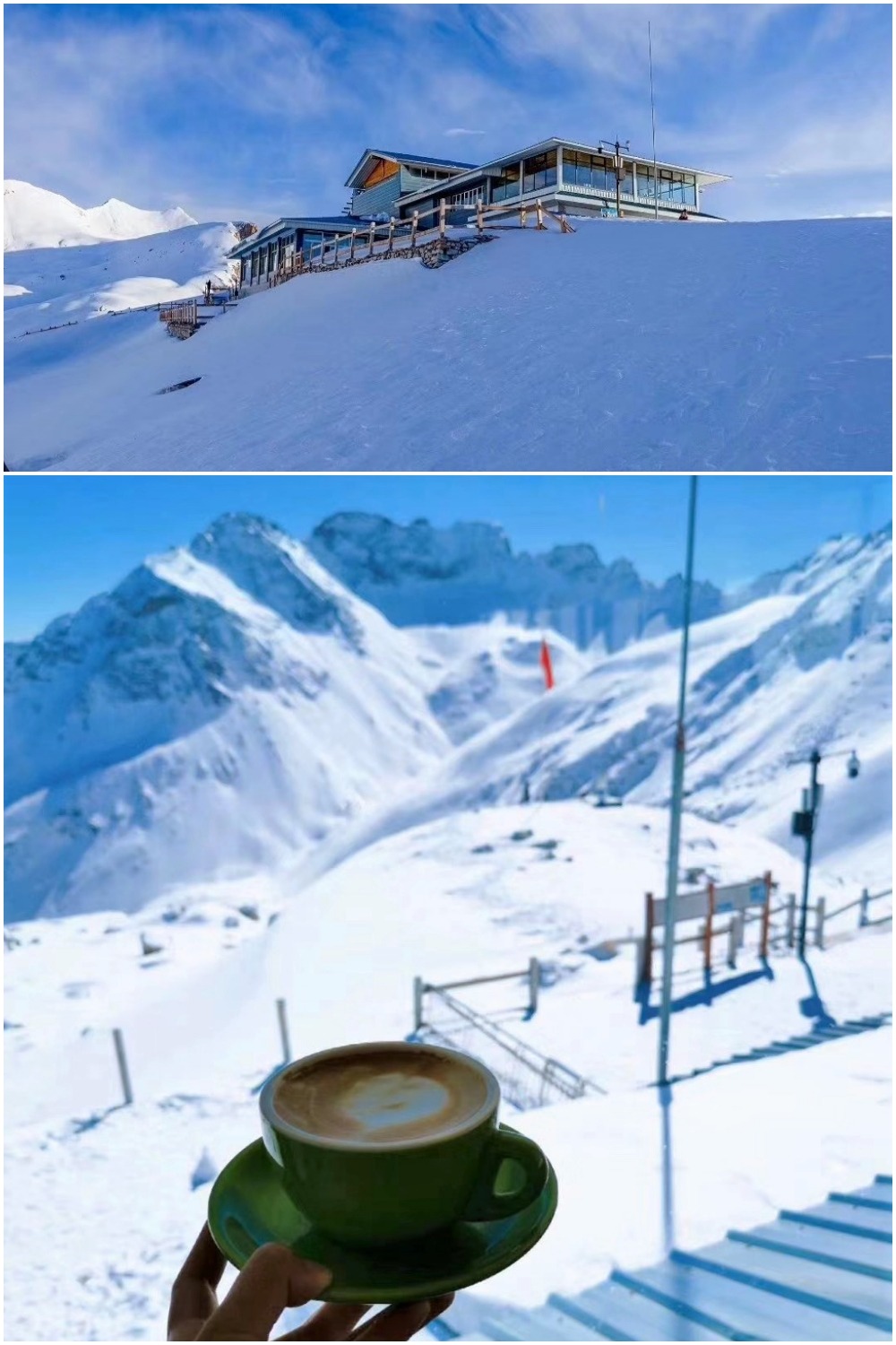 搭乘纜車穿過層層雲霧,越過條條冰川,到索道站二樓,才能最終抵達這座被純淨雪景包圍的咖啡館。