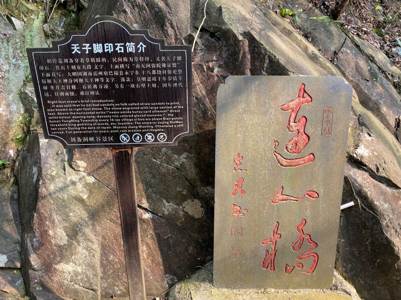 天子腳印石最具傳奇色彩。傳說劉備在此地閒憩數天後,在路邊的青石板上舞刀弄槍練功,突來興致,用力連踩3步,身輕如燕般躍過了3丈多寬的峽谷,站立在對面的石柱上,起飛時劉備在石頭上烙下3個腳印。