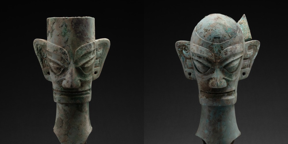 青銅人頭像是三星堆文明中極具代表性的一類青銅器,截至目前發現的人頭像主要有平頭與圓頭兩種,平頭者辮發,圓頭者戴發簪,眉眼塗黑的情況較為常見。