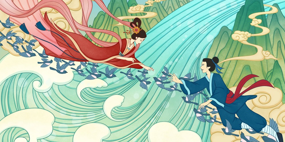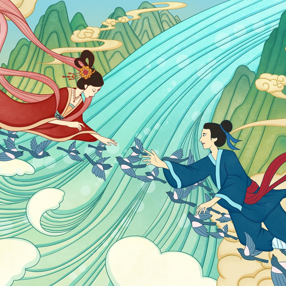 他們堅貞的愛情感動了鵲橋上的喜鵲,喜鵲用身體搭成一座能跨越天河的鵲橋,讓二人能夠於天河上相會。