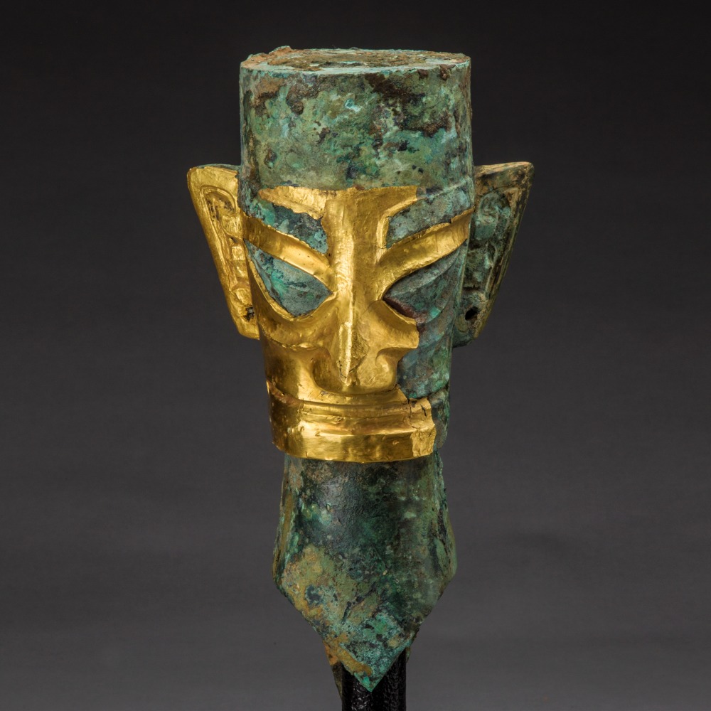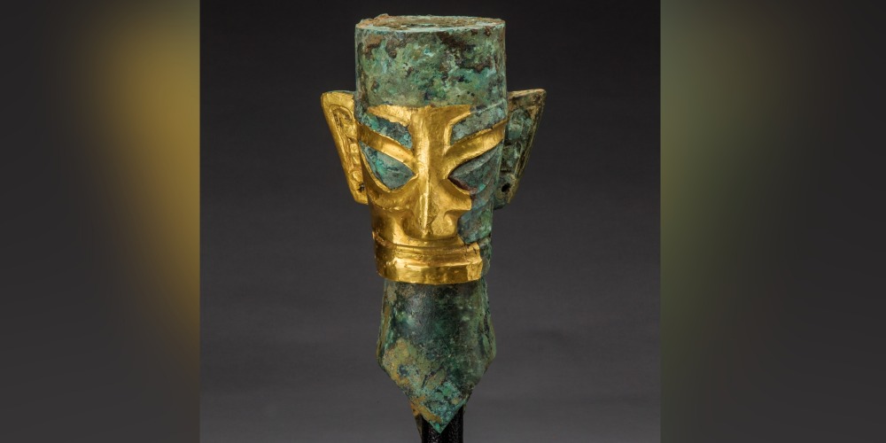 1986年出土於三星堆遺址2號祭祀坑的這件戴金面罩銅人頭像,是大家最熟悉的三星堆形象之一。