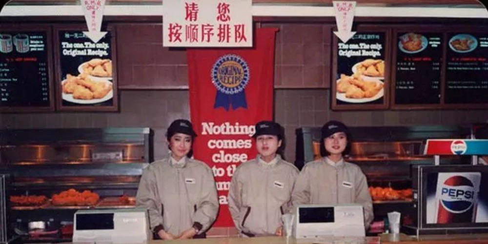開幕當天,數十名身穿民族服的少女,在一幅以中、英和日語寫有「美國肯德基家鄉雞開業」的橫幅前,落力表演中國傳統歌舞,既是慶祝開張大吉,亦標誌改革開放邁向新里程。