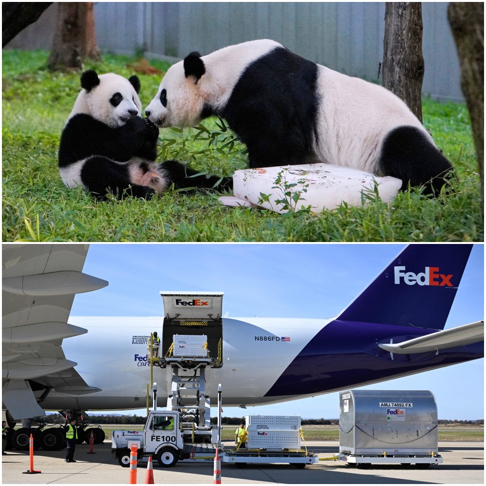 當地時間11月8日,史密森學會國家動物園工作人員將三隻裝有大熊貓的特製「旅行包廂」、220磅竹子、飲用水及相關物資運上卡車,載有「美香」、「添添」和「小奇迹」的車隊駛離動物園前往機場,動物園三名飼養員隨行。
