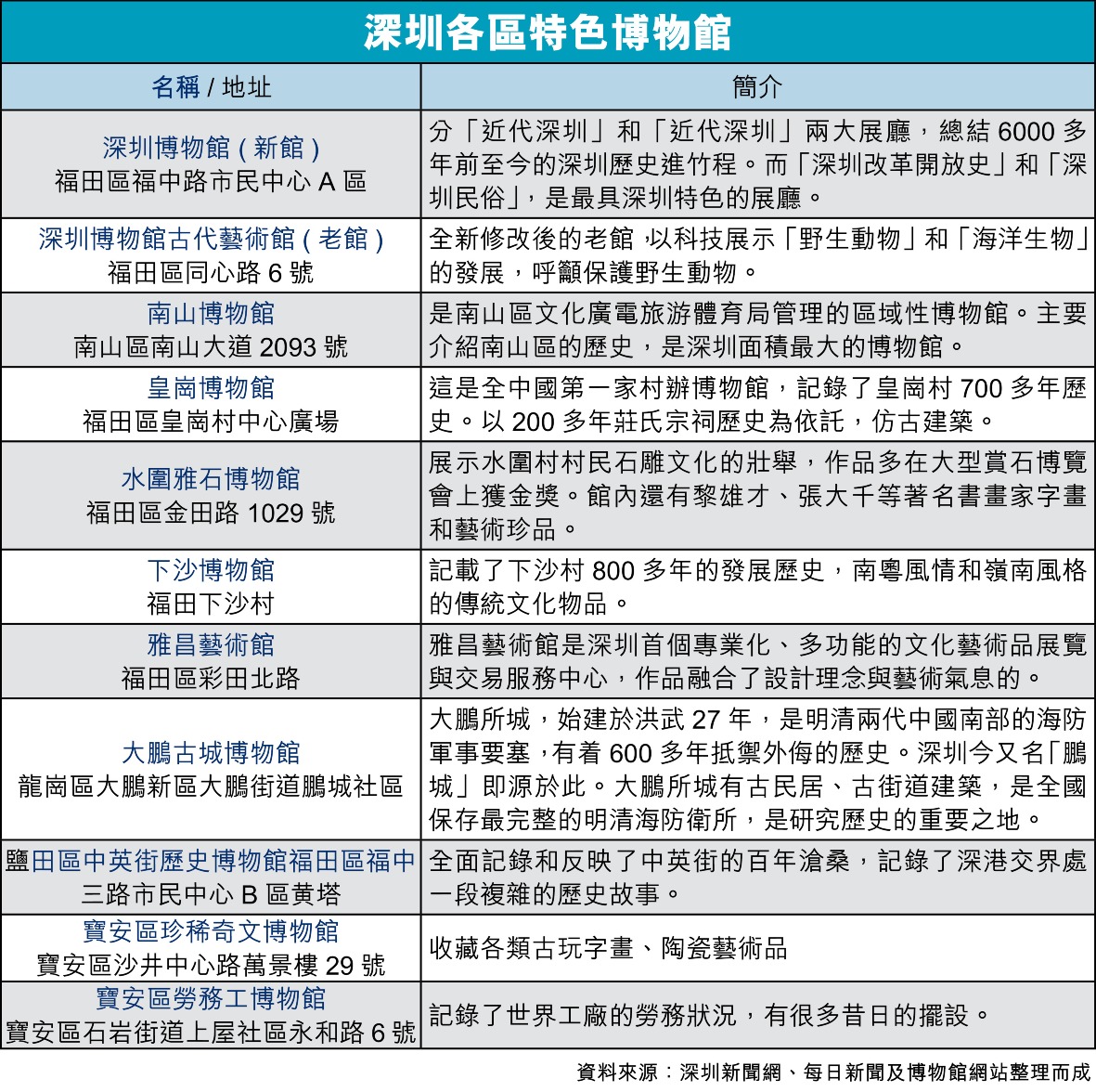 國家一級博物館「中國國家博物館深圳館(暫名國深博物館)」已落實在前海灣濱海區域動工,深圳博物館老館(古代藝術館)維修工作亦剛剛竣工,一新一舊館把經濟特區深圳光輝的成果統統紀錄下來。計地區性的「南山博物館」和「龍崗文博展覽館」落成後,深圳的博物館變得更多元化。除了歷史外,未來會有「物流博物館」、「數字通訊博物館」、「鋼琴博物館」等,在在記錄經濟特區深圳在中國經濟急促發展下的種種神話。