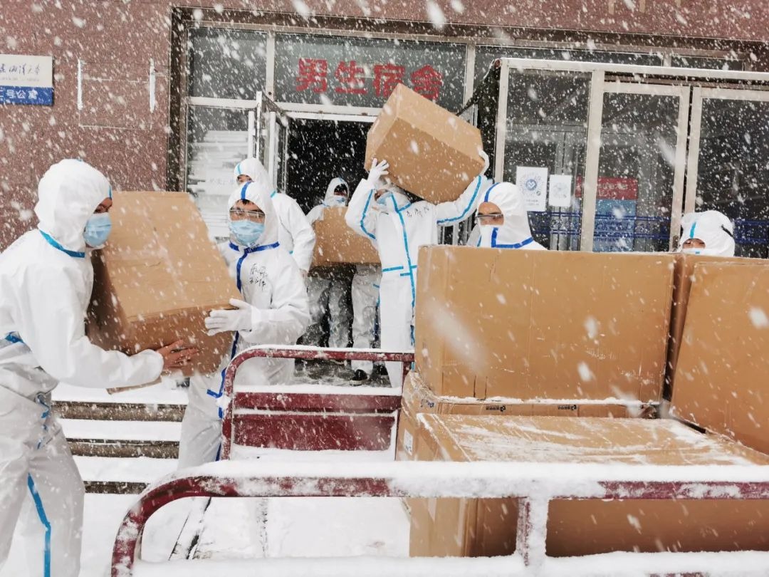 有人或會質疑,為何不用汽車或工具代步?但現實是,暴雪來得很急,汽車等一般交通工具根本難以出行,加上每天運送的物資數量不少,在疫情下要調動運輸工具非常困難。這隊由17個學生組成的義工隊,就決定用最簡單的方式,以推車的方式為全校師生運送食物和日用品。