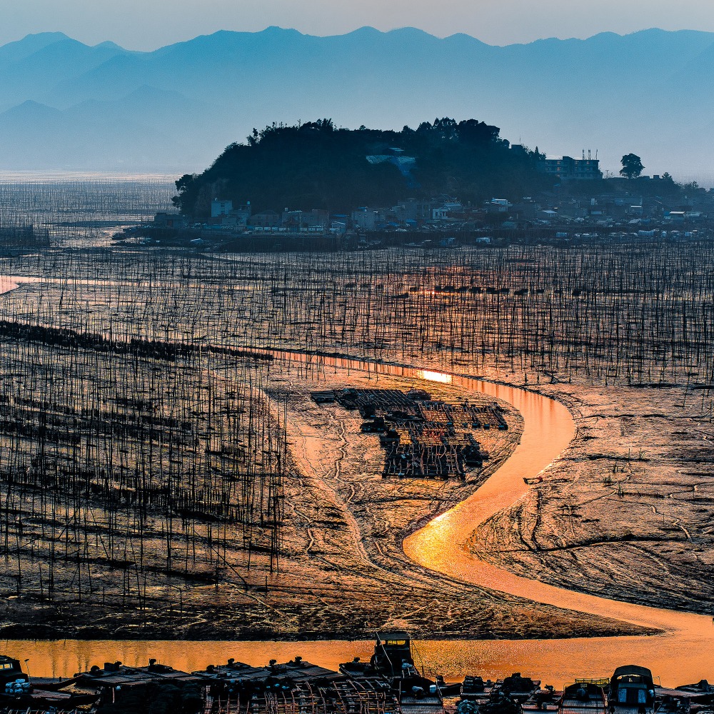 霞浦縣內的沙江鎮山水秀麗,富有中國文化氣息,一支支養殖用的竹竿,錯落有致地插在S形水道兩旁的灘塗,構成獨特優美的霞浦風景。