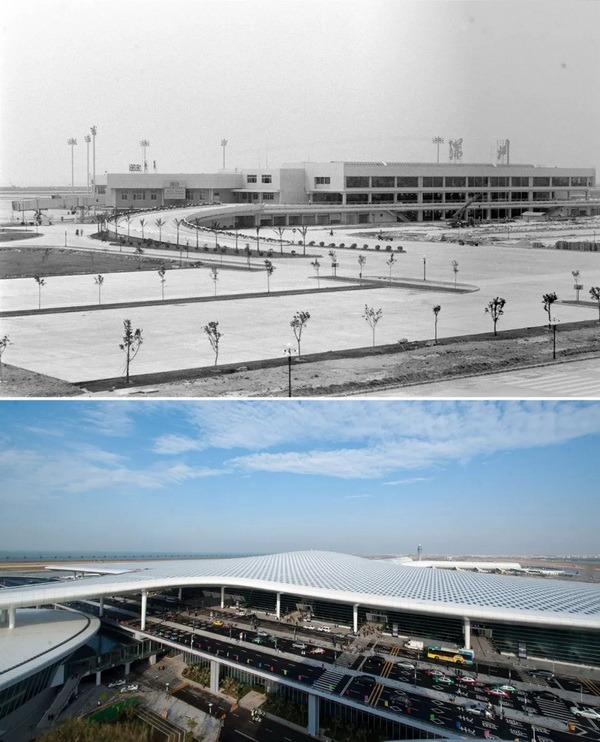 上圖:深圳機場舊的航站樓。下圖:2013年拍攝的新啟用的深圳機場航站樓。(網絡圖片)