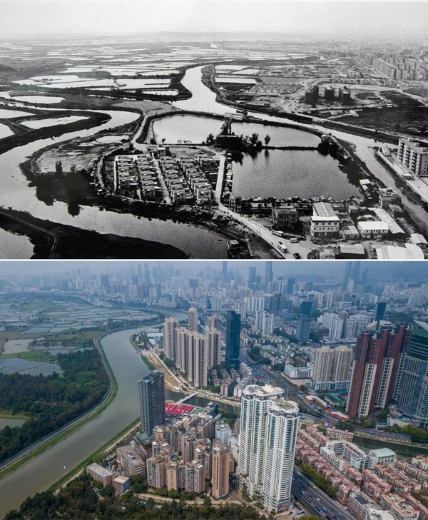 上圖:建設中的深圳羅湖區。下圖:2018年無人機拍攝的深圳羅湖區。 (網絡圖片)