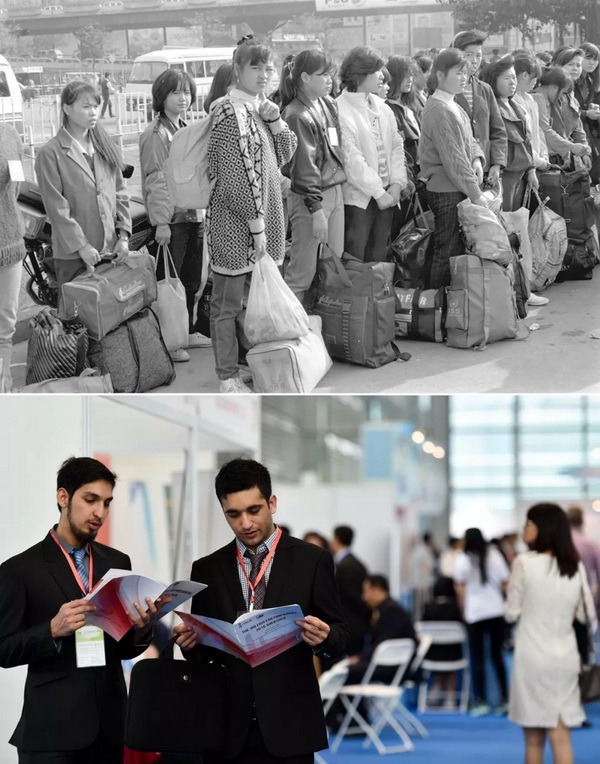上圖:在深圳打工的外地務工者在火車站候車,準備回家探親。下圖:2015年在深圳舉行的中國國際人才交流大會上,兩位外籍應聘者查看職位情況。(網絡圖片)