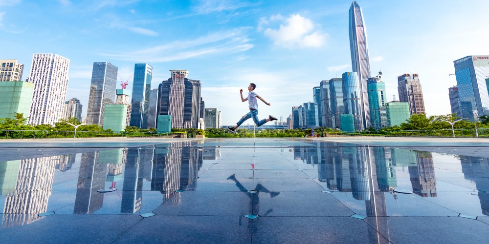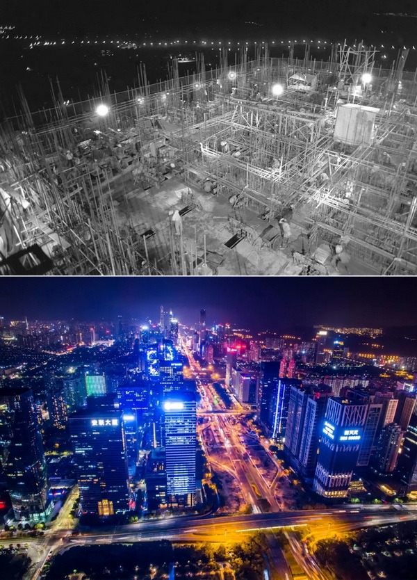 上圖:建築工人在深圳國際貿易中心大廈工地工作。下圖:2017年無人機拍攝的深圳夜景。(網絡圖片)