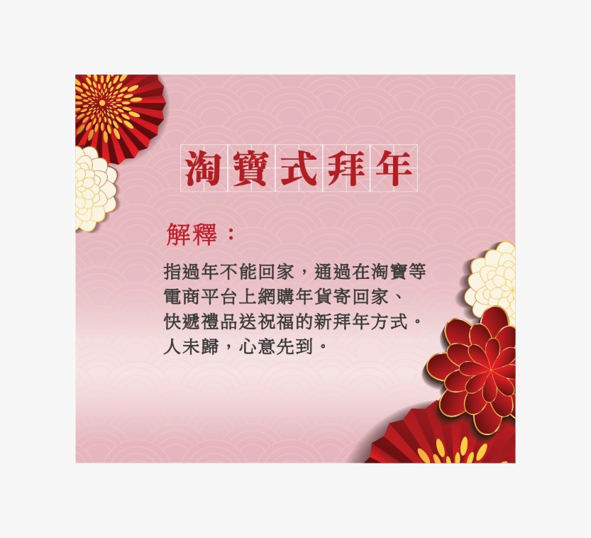 「淘寶式拜年」指過年不能回家團聚的人們,通過淘寶等電商平台購買年貨或禮物,再直接寄給父母或者親朋好友,代替以往見面拜年的習慣。所謂人不到但禮數不能少,雖然這樣的線上拜年方式欠缺氣氛,但在特殊時期下頗有苦中作樂的意味,也被大多數年輕人所接受。
