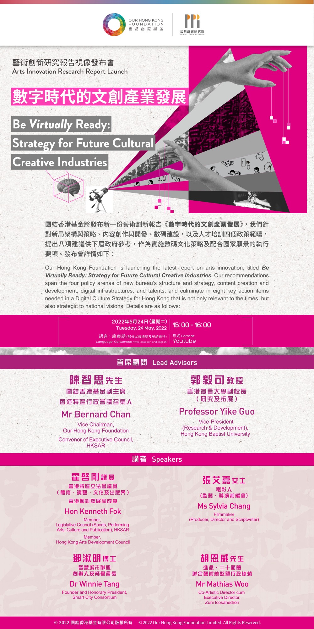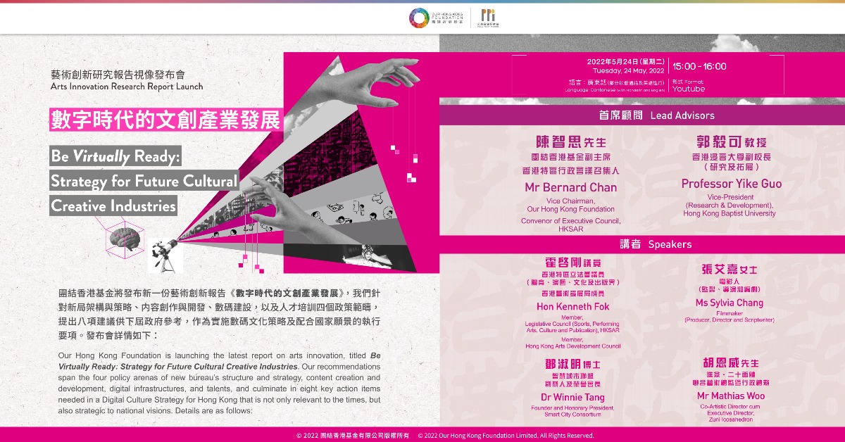 團結香港基金將發布新一份藝術創新報告《數字時代的文創產業發展》,於2022年5月24日作網上現場直播。