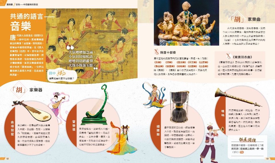 上冊主題為古代絲綢之路,分別以古絲路上的開拓者、物質交流、宗教、藝術、商貿活動、科技為題,以「信」貫穿,立體展現這條古老通道上如何以人文互信精神,帶來文明與文化的豐盛發展。