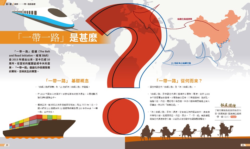下冊圍繞「一帶一路」人情物事,從「一帶一路」的概念說起,展示今天沿線各地的新貌、物質、文化、經濟交流,探索內涵,擁抱變遷,迎接騰飛,傳承文化,互鑑共謀發展。